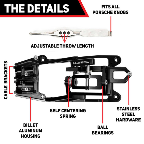 Now used in almost every Porsche race team in America. Numeric Racing's shifters are not only good for race applications, but is a very popular upgrade for daily drivers. This work of art has a multi-adjustable shift lever for various throws and adjustable cable mono blocks for horizontal lever placement. It's evolutionary structure is CNC machined from aerospace grade aluminum, stainless steel hardware and includes precision ball bearings to ensure undeniable accuracy. This do-it-yourself upgrade can be installed in just under an hour with no modifications! Its OEM friendly design allows full center console use and lever adjustment with a simple lift of the boot.